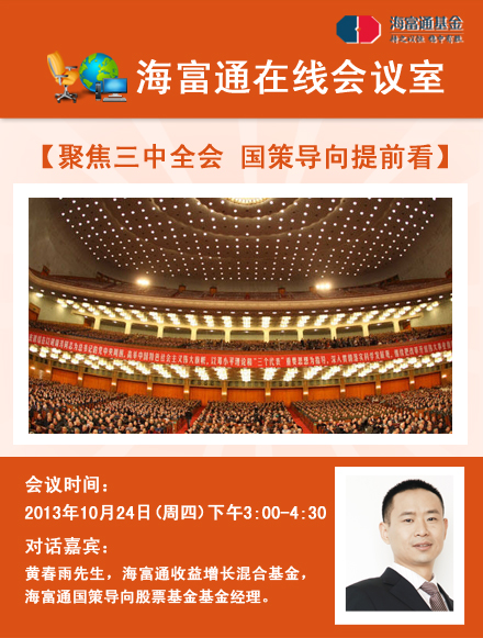 海富通在线会议室特邀请基金经理黄春雨做客,为大家解读以上问题。他认为:三中全会后,TMT行业,环保行业都有可能成为调结构的受益者,获得较快的发展机会。