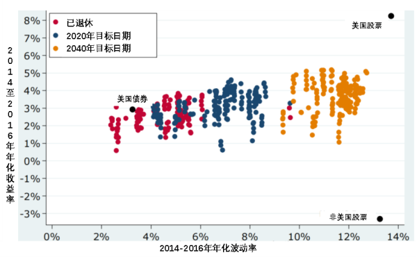 下图是德勤的一项研究,目标日期基金的收益率和波动率,不同到期时间的产品有不同的水平。相对远期到期的目标日期基金(如2040目标日期),其波动率明显比近期到期的产品要高(2020到期),但年化收益率也相对要高。而已进入退休支付阶段的目标日期基金,波动率明显较低,同时收益水平也较低。