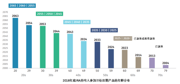 据统计,美国IRA持有人选择的目标日期基金中,基本与预期退休年龄对应。比如20-29岁年龄段的人群,选择2054-2065年到期的目标日期基金(见下图)。