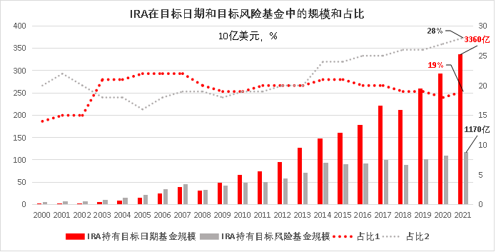 另外一种目标基金是目标风险基金,该类产品会长期固定在某一风险偏好水平,并不随持有人年龄的增加而变化。人们的风险偏好随着年龄的增加会逐步改变,因此需要不时变更目标风险基金的选择。而目标日期基金仅与退休年龄相关,一旦选定就不需要再变动,因此目标日期更受IRA持有人欢迎。据ICI统计,截至2021年底,IRA持有目标日期基金和目标风险基金的规模分别为3360亿美元和1170亿美元(见下图)。