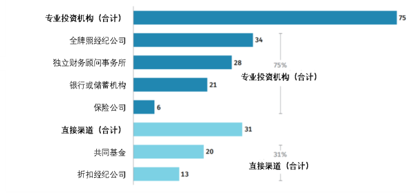 为解决IRA持有人选择产品的难题,除了提供标准化的目标基金产品之外,金融机构还广泛提供养老投资顾问服务。IRA持有人一般通过专业投资机构建立IRA账户,选择金融产品,合计可达75%的占比(如下图)。其中全牌照的经纪公司以及独立的财务顾问事务所占主导,分别达34%和28%的比例。IRA持有人也通过银行储蓄机构(21%)和共同基金公司(20%)建账和选择产品。