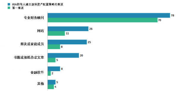 IRA持有人在确定个人养老金的资产配置策略时,最主要的咨询方是专业的财务顾问,占78%,而且有70%的将其作为咨询的第一选择(见下图)。与标准化配置策略的目标基金相比,养老投顾会根据个人资产负债情况、主客观风险承受能力、预期退休日期、预期退休生活水平及节税等个性化需求,设计个性化的资产配置方案。这降低了个人选择产品的困难度,还提升了投资目标的精细度与匹配度。美国很多共同基金在提供个人养老金产品的同时增加了投顾咨询服务,为IRA持有人提供更细致、全面、长周期的一站式服务。
