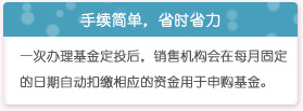 “基金定投”指投资者每月在固定时间,以固定金额申购开放式基金的投资行为。由于每期投入金额相同,基金定投具有逢低购买更多份额,逢高购买较少份额的特点;长期看,基金定投能取得平均的市场投资成本,有望分散投资风险。